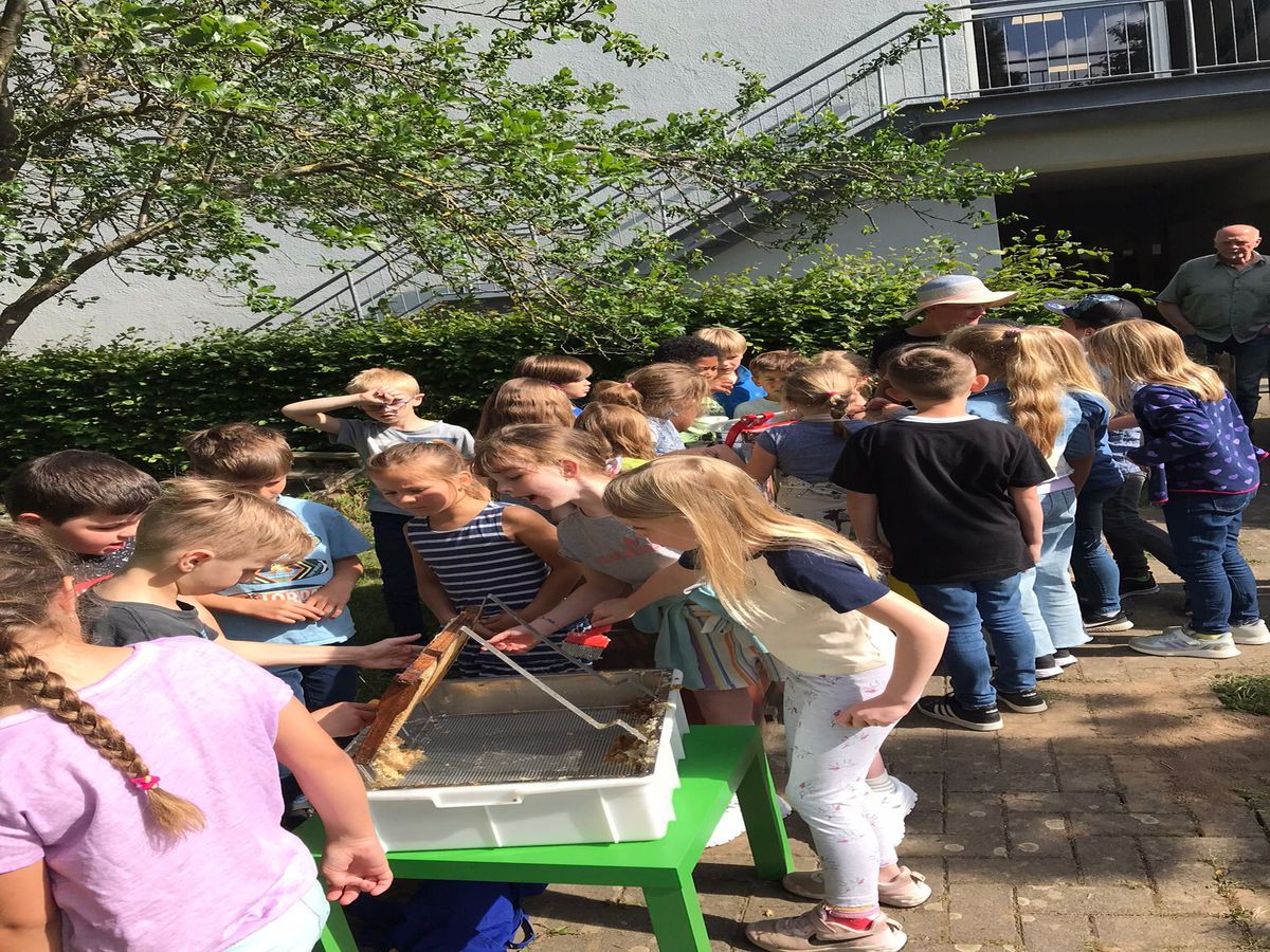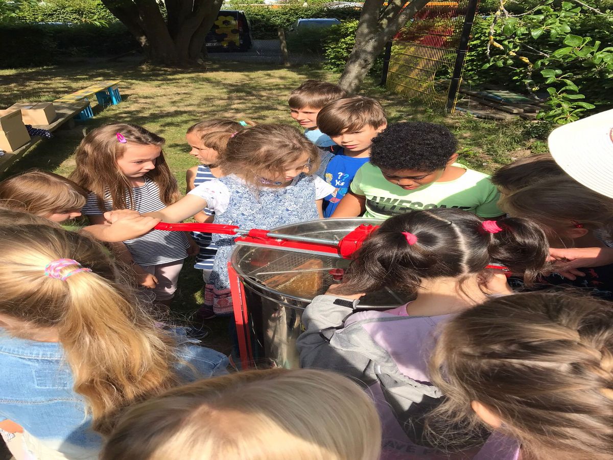 Die Kinder waren mit Feuereifer bei der Sache! Natürlich wurde der Honig schon gekostet, vielleicht hatten einige Kinder vom vielen Schlecken etwas Magengrummeln.