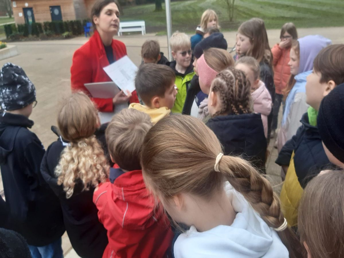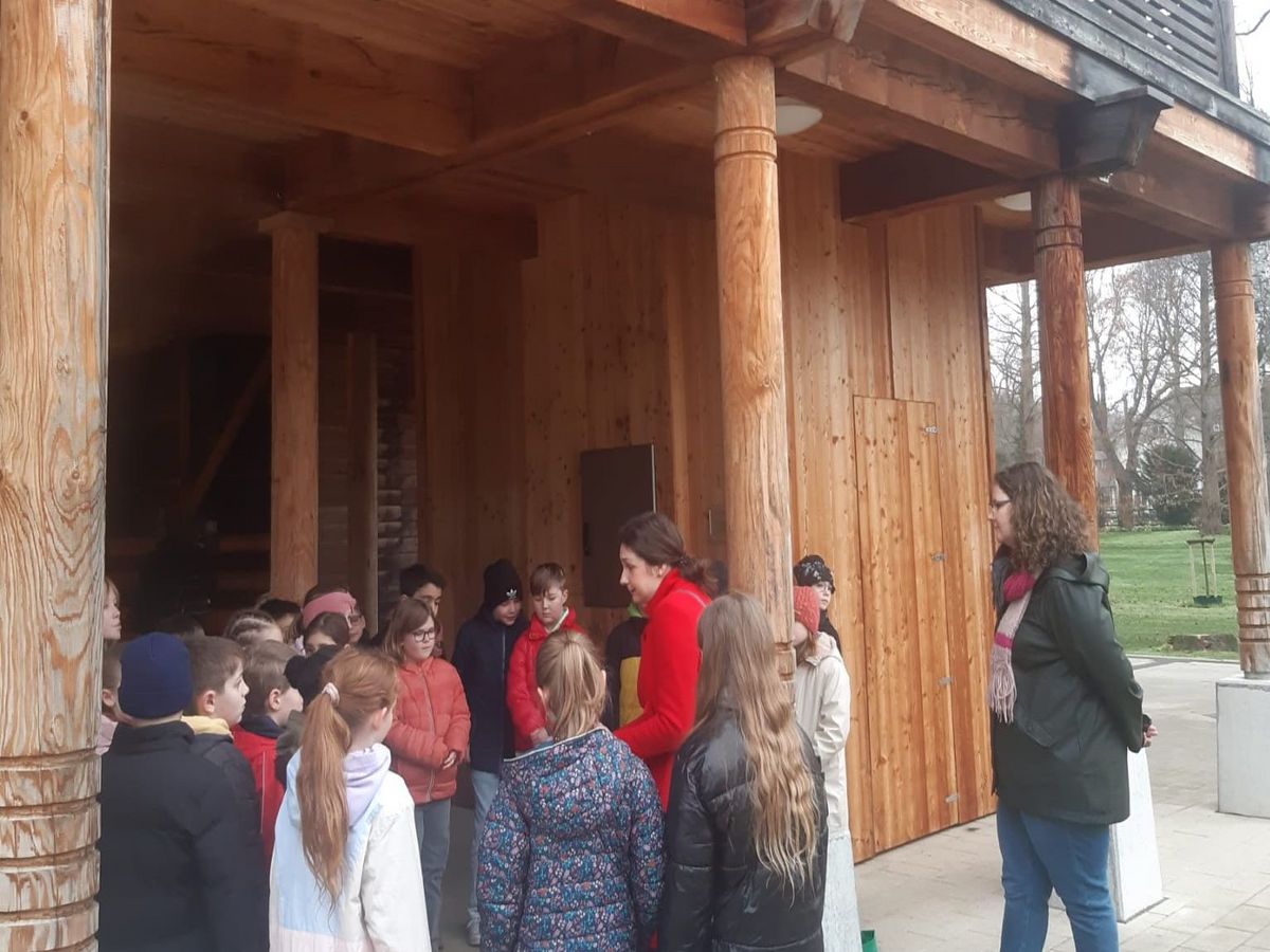 Die Kinder der Klasse vier haben sich im Kurpark mit dem Team der Salzwelten getroffen und bekamen eine Gradierwerkführung.