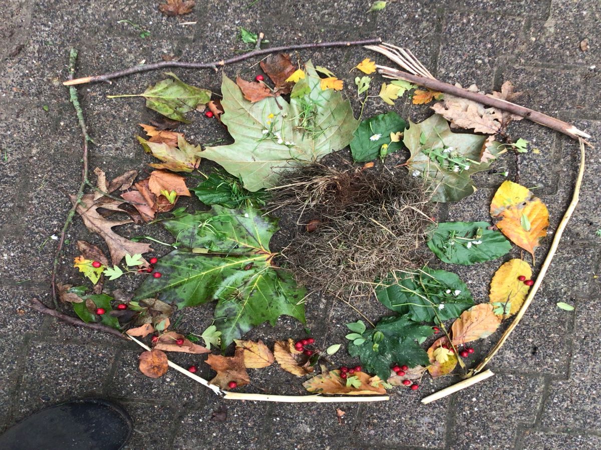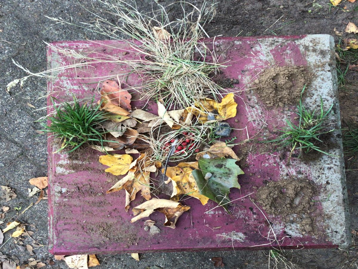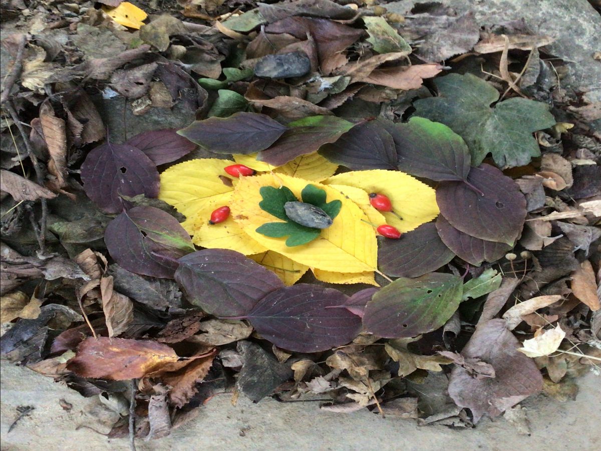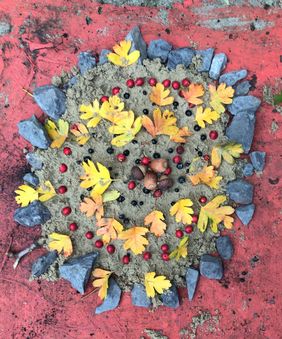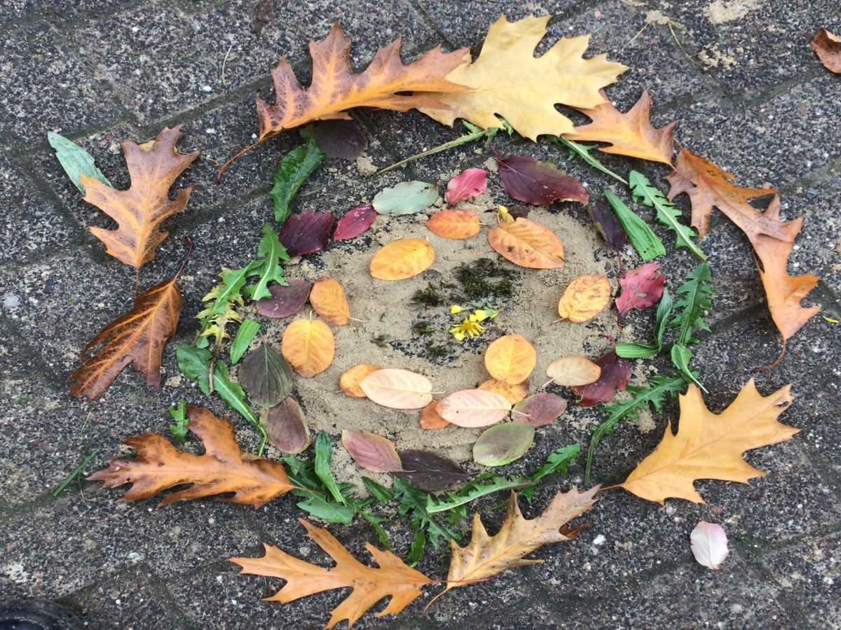 Auf dem Schulhof wurde gesammelt und anschließend in kleinen Gruppen je ein Bodenbild mit herbstlichen Materialien gelegt.