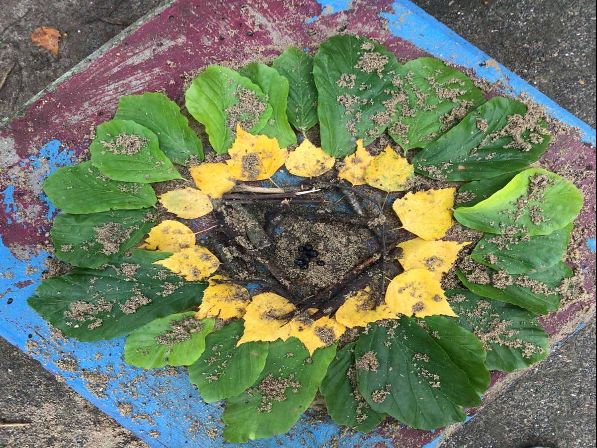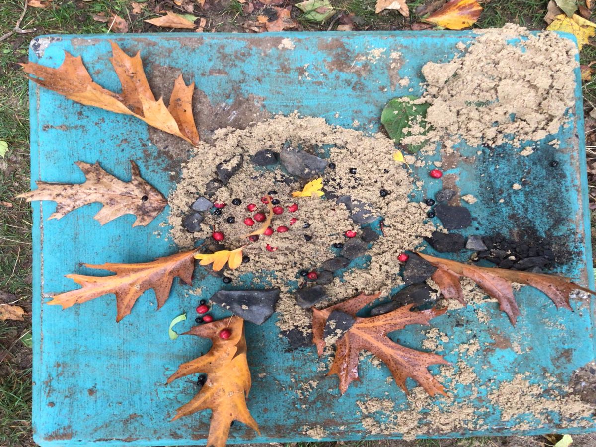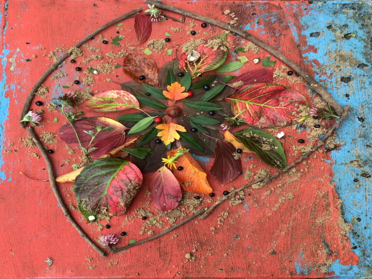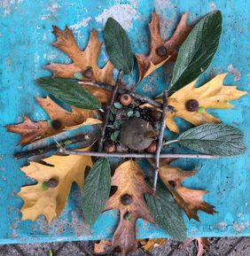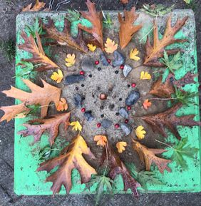 Auf dem Schulhof wurde gesammelt und anschließend in kleinen Gruppen je ein Bodenbild mit herbstlichen Materialien gelegt.