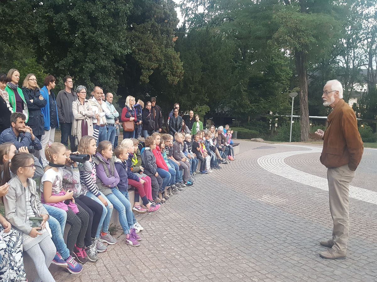 Geleitet wurde sie von Naturkundler und dem Vorsitzenden der "Arbeitsgemeinschaft Biologischer Umweltschutz" (ABU) Dr. Vierhaus. Als Überraschung und zur Freude aller Kinder hatte Dr. Vierhaus Fledermaus Hanni mit dabei, und erzählte viel über Fledermäuse. Im Anschluss machten sich alle - ausgerüstet mit Taschenlampen und Ortungsgeräten - im Kurpark auf die Suche nach Fledermäusen. Jetzt freuen sich alle auf die Herbstferien und die sich anschließende "Fledermaus-Einheit".